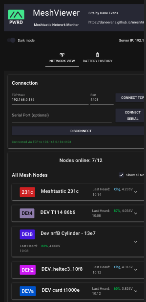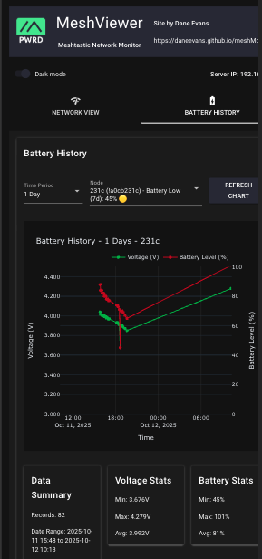 data/ directoryMeshViewer can be run from a Raspberry Pi Zero, desktop computer, or any system with Python support. It communicates with nodes via either serial or TCP connections and is designed for continuous operation to provide comprehensive logging and analysis of mesh network health.